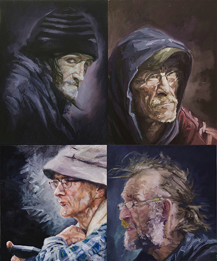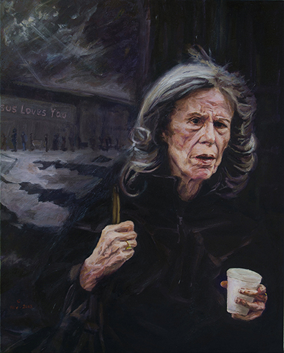 I titled this painting Looking for a Lighter. It seems the man with a cigarette is searching for a lighter. In reality, I was deliberately hiding the truth. The cleanly dressed but disabled elderly woman had likely just run away from a nearby shelter and was buying drugs on the street. Drugs bring her temporary relief, much like alcohol for many others.
