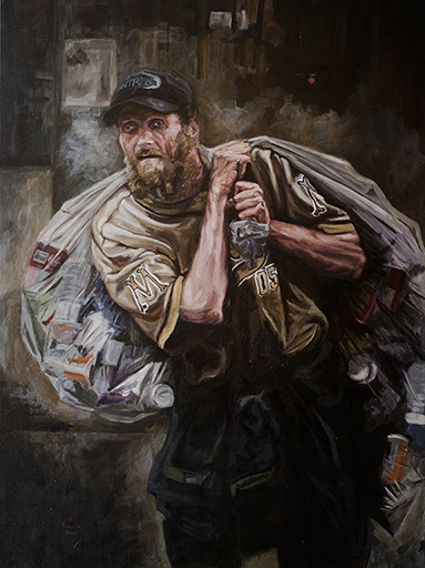 The person in this painting has an eye condition; his eyes gaze in two different directions. He wears a golden ice hockey jersey and a cap, with thick, dark, out-of-season clothing wrapped around his waist. A giant plastic bag slung over him is stuffed full of empty beverage bottles. He is a typical “person on Vancouver streets,” a familiar sight to passersby.