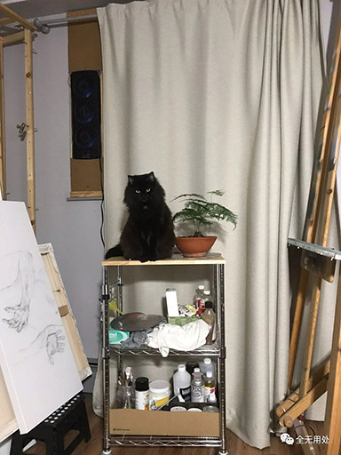 The black cat I adopted had a bad temper.But as time passed, maybe out of loneliness,she would lie on my lap while I painted,or on my arm while I played games.